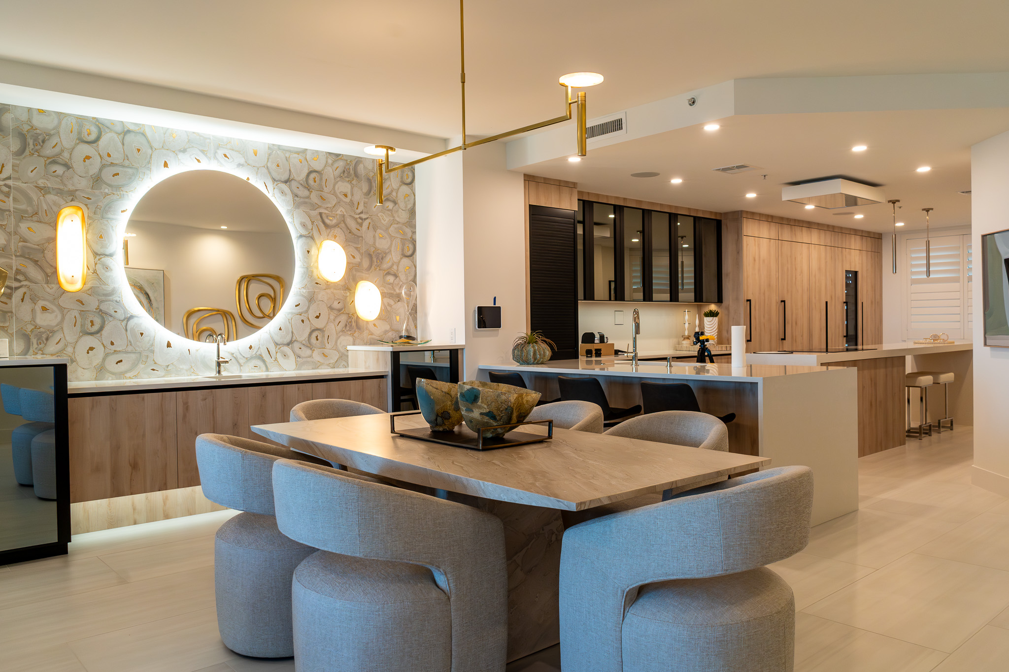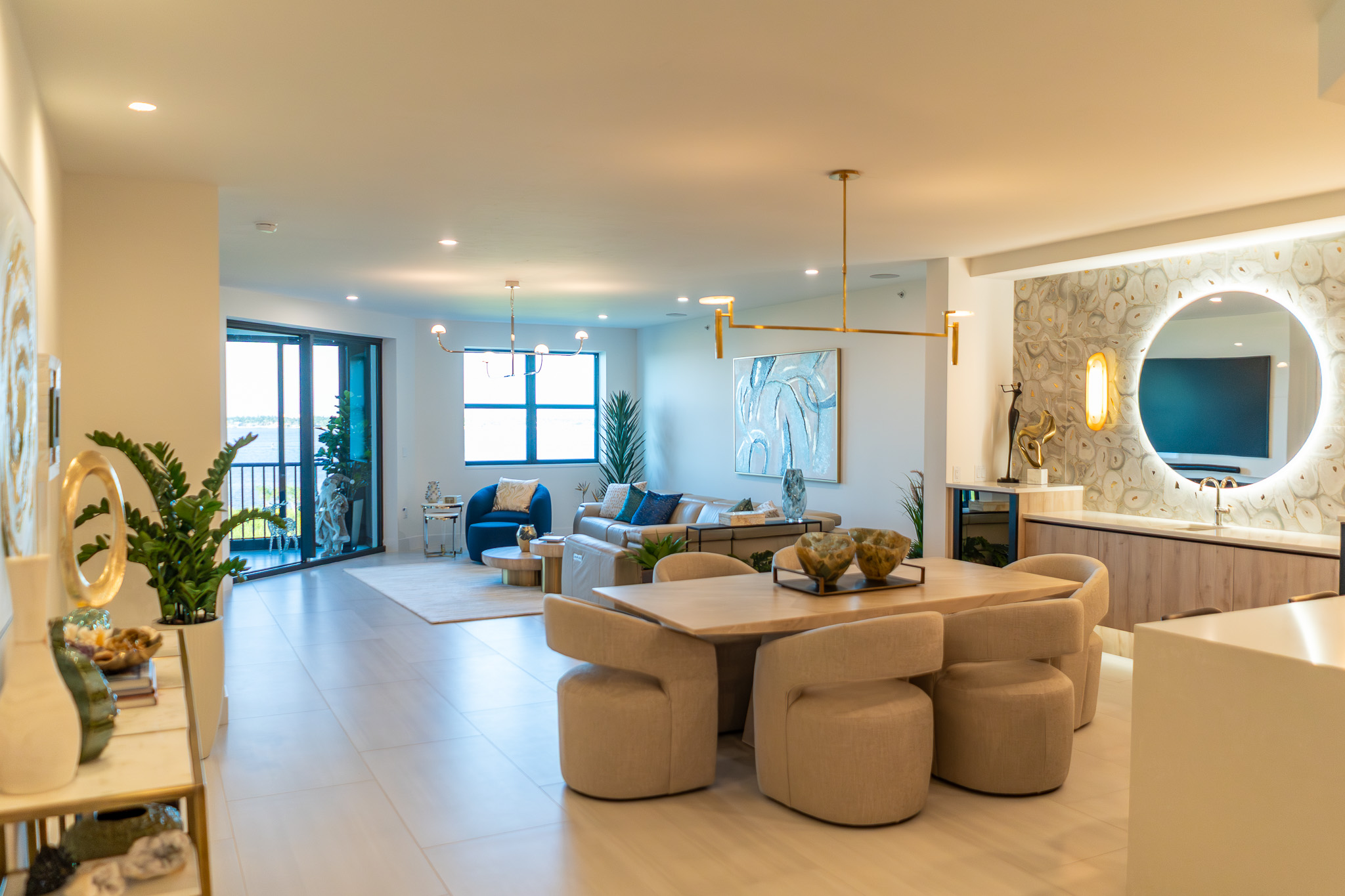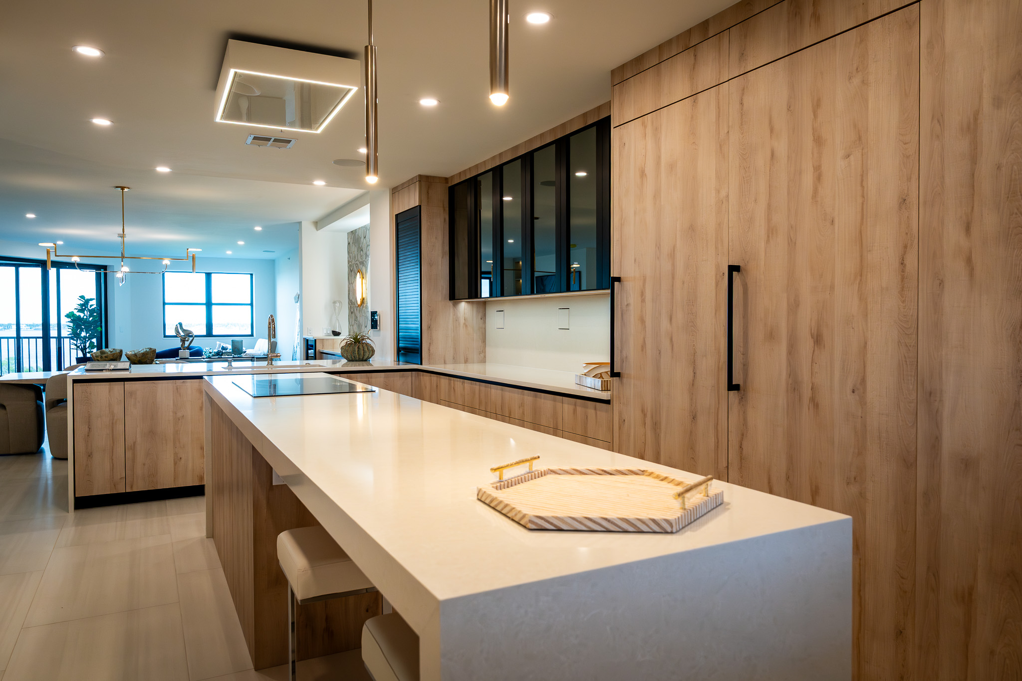 - Description: Court of Palms is a high-end condominium residence completely reimagined for modern, coastal living. This thoughtfully renovated home blends quiet luxury with clever functionality, opening from the entry into a seamless flow between kitchen, dining, and living spaces. Custom cabinetry and integrated storage anchor the heart of the home, while hidden shelving, built-in niches, and discreet smart-home controls keep every surface calm, clean, and uncluttered. Layered lighting, warm finishes, and tailored details create an atmosphere that feels both refined and relaxed—equally suited to everyday living or effortless entertaining. Designed for those who value comfort, simplicity, and elevated design, Court of Palms turns a traditional condo into a curated private retreat.