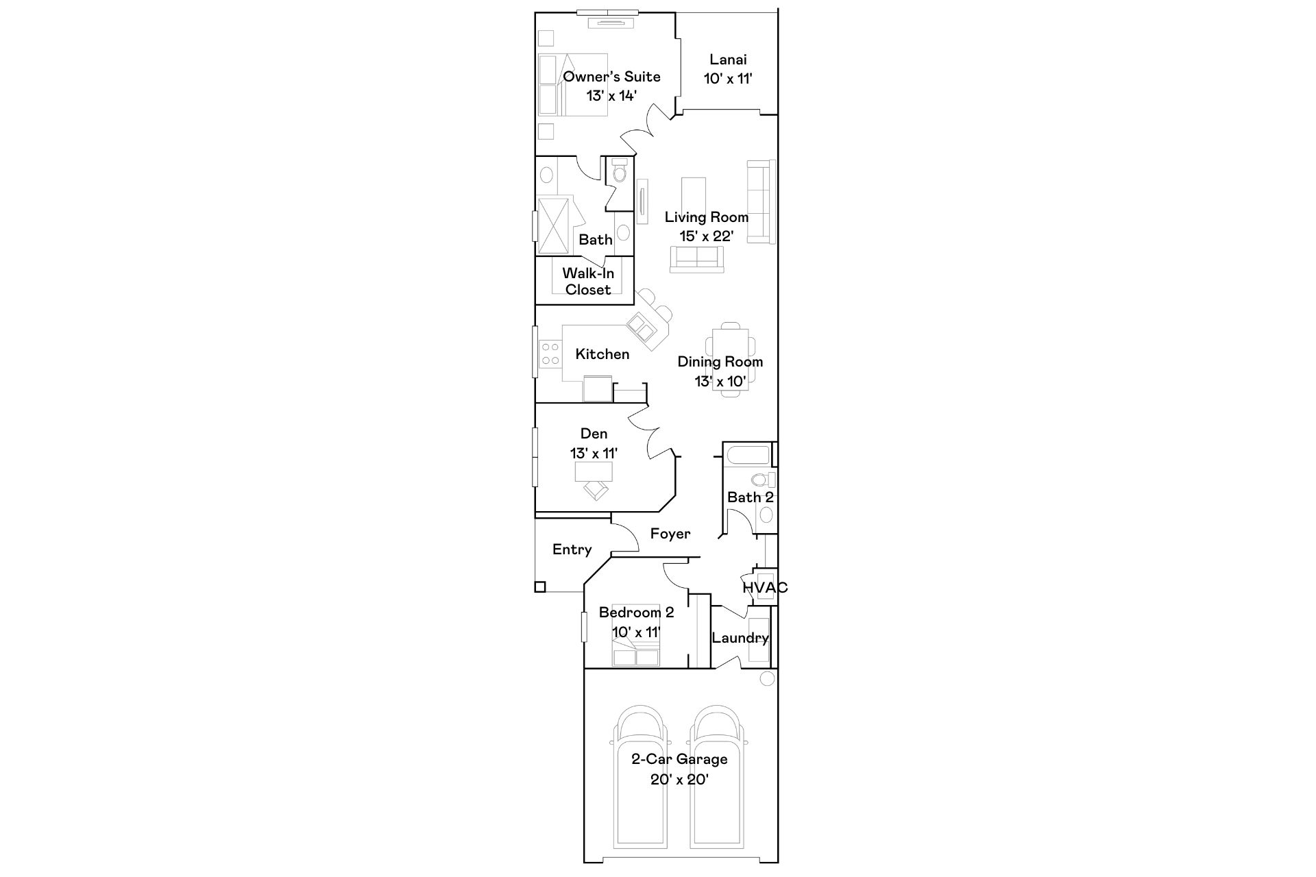 - Description: This attached single-story home delivers a cohesive design fit for modern living. Socialize on the stylish lanai or hideaway in the den, flexible as a study or media room. A front bedroom and bathroom create privacy for the owner’s suite with walk-in closet, which enjoys a back corner location.