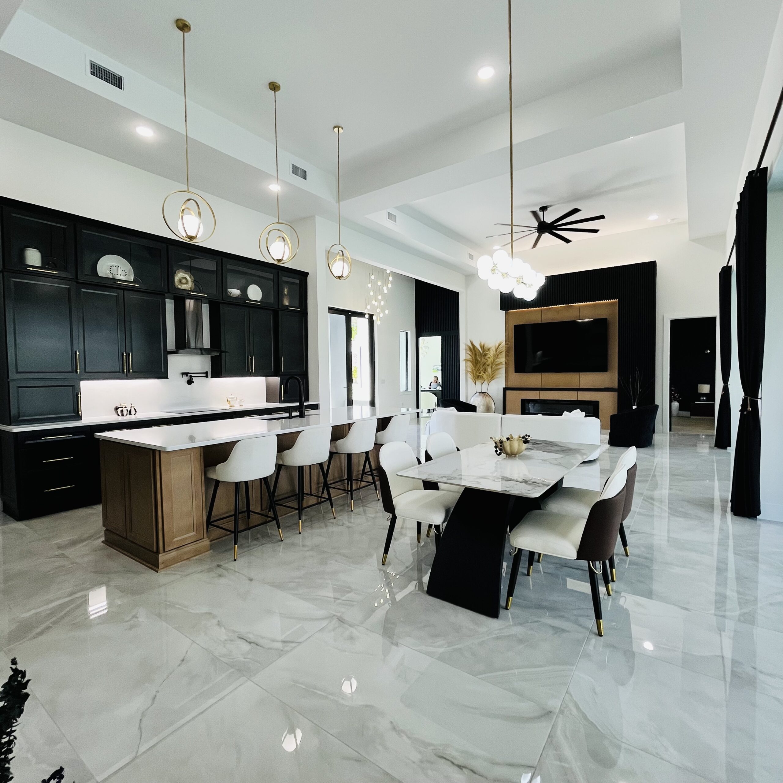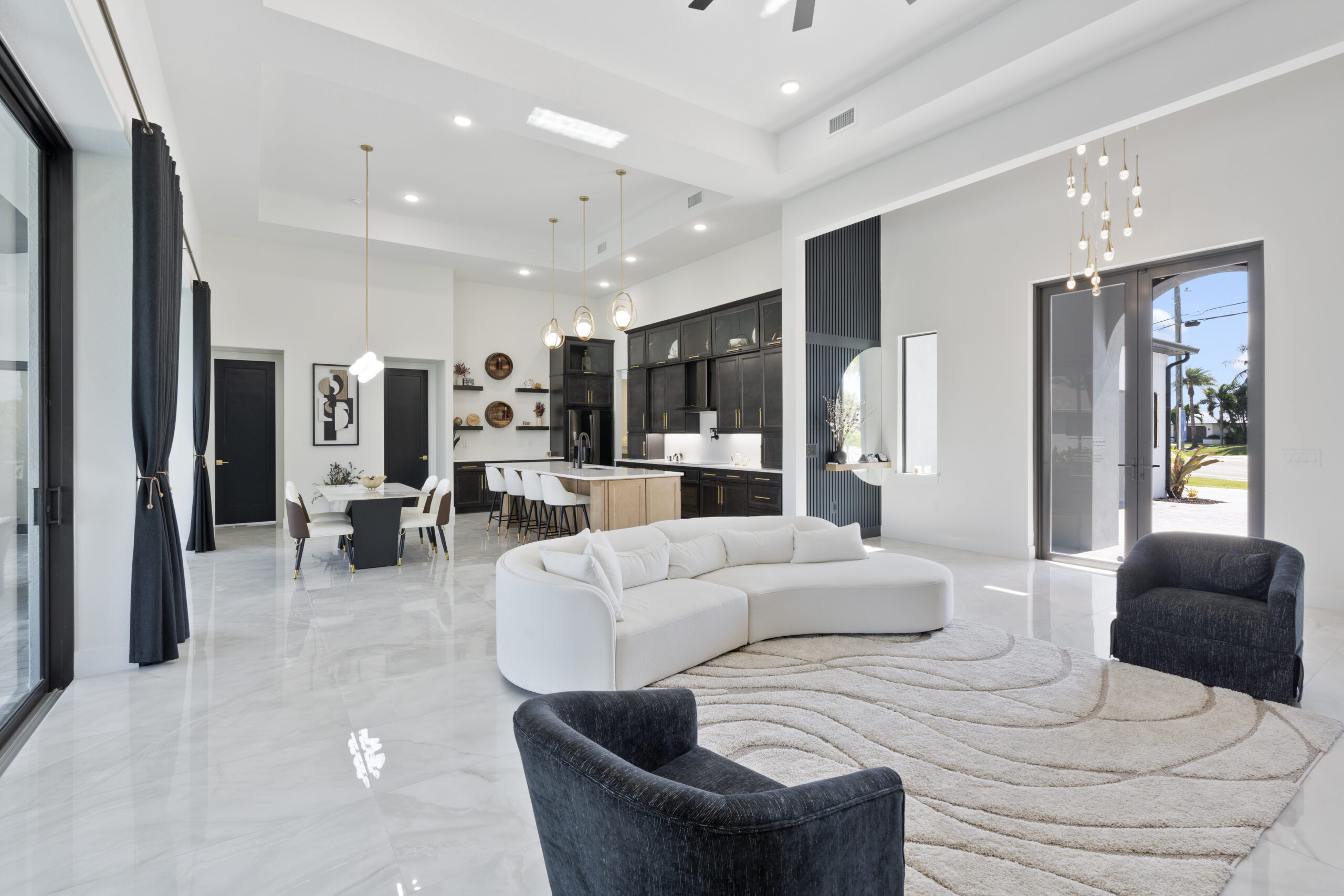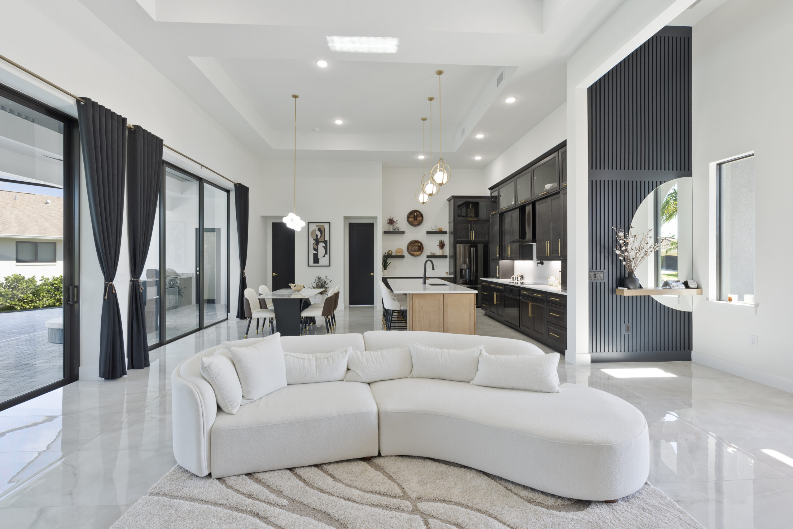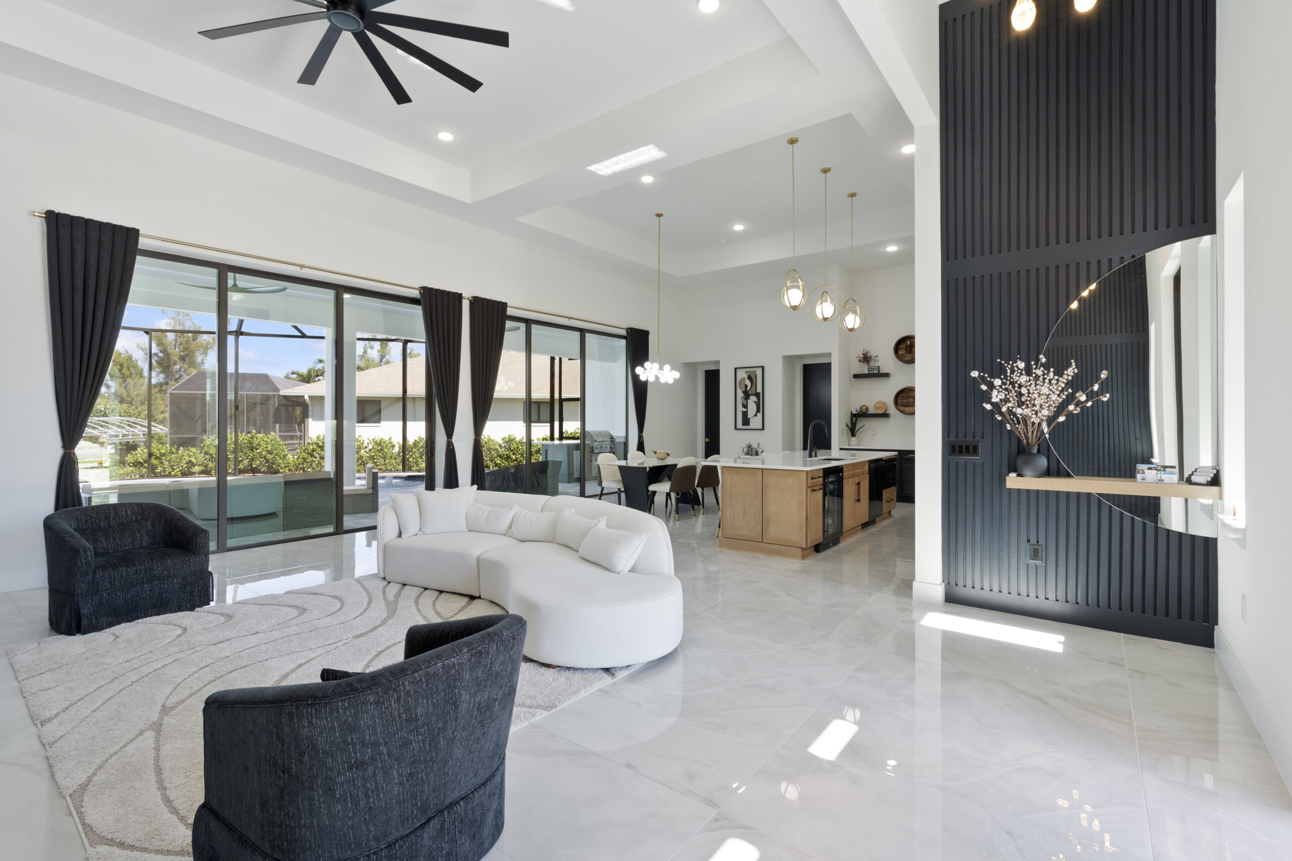 - Description: This gem offers an unforgettable first impression, blending luxury with functionality in every detail. Step through grand 10-ft double glass entry doors into a meticulously designed interior featuring soaring ceilings up to 16.5 ft in the great room and 10-ft glass sliding doors that create a seamless indoor-outdoor flow. A hidden door off the foyer cleverly conceals a private office tucked inside the rotunda, perfect for those working from home or needing a quiet retreat. The chef-inspired kitchen showcases double-stacked cabinets with upper glass displays, quartz countertops throughout, upgraded appliances, and a designer range hood. The entertainment space features a custom entertainment wall with a built-in fireplace and a massive 100” TV, ideal for entertaining and relaxing. Every inch of this home reflects quality and attention to detail—from the accent wall in the master suite to vessel sinks in all bathrooms and upgraded vanities (double in the master and guest baths). The master suite offers private access to the lanai via glass sliders, while a clear-glass door from the guest bedroom also opens to the outdoor oasis. Step outside to an oversized covered lanai with a fully equipped outdoor kitchen featuring upgraded granite, perfect for entertaining in the Florida sunshine.